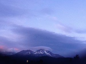 It was the poet Joaquin Miller who said Mt. Shasta was “lonely as God and white as a winter moon.” To me, it looked more like a chocolate sundae with marshmallow cream. But as I sat on my deck at the Tree House, I watched the sun set and the mountain morph into a heavenly icon. An aura was forming over its peak, and it looked like a halo of wispy white clouds or a spaceship hovering above.