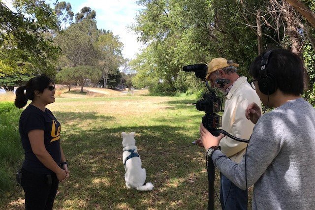 Cinematographer David Mai, director Daniel Julien, dog owner Meching Mai and rescued dog Nova appear together. Montclair resident Julien debuted his new movie, “For the Love of a Dog” this week at Warehouse 416 in Oakland.