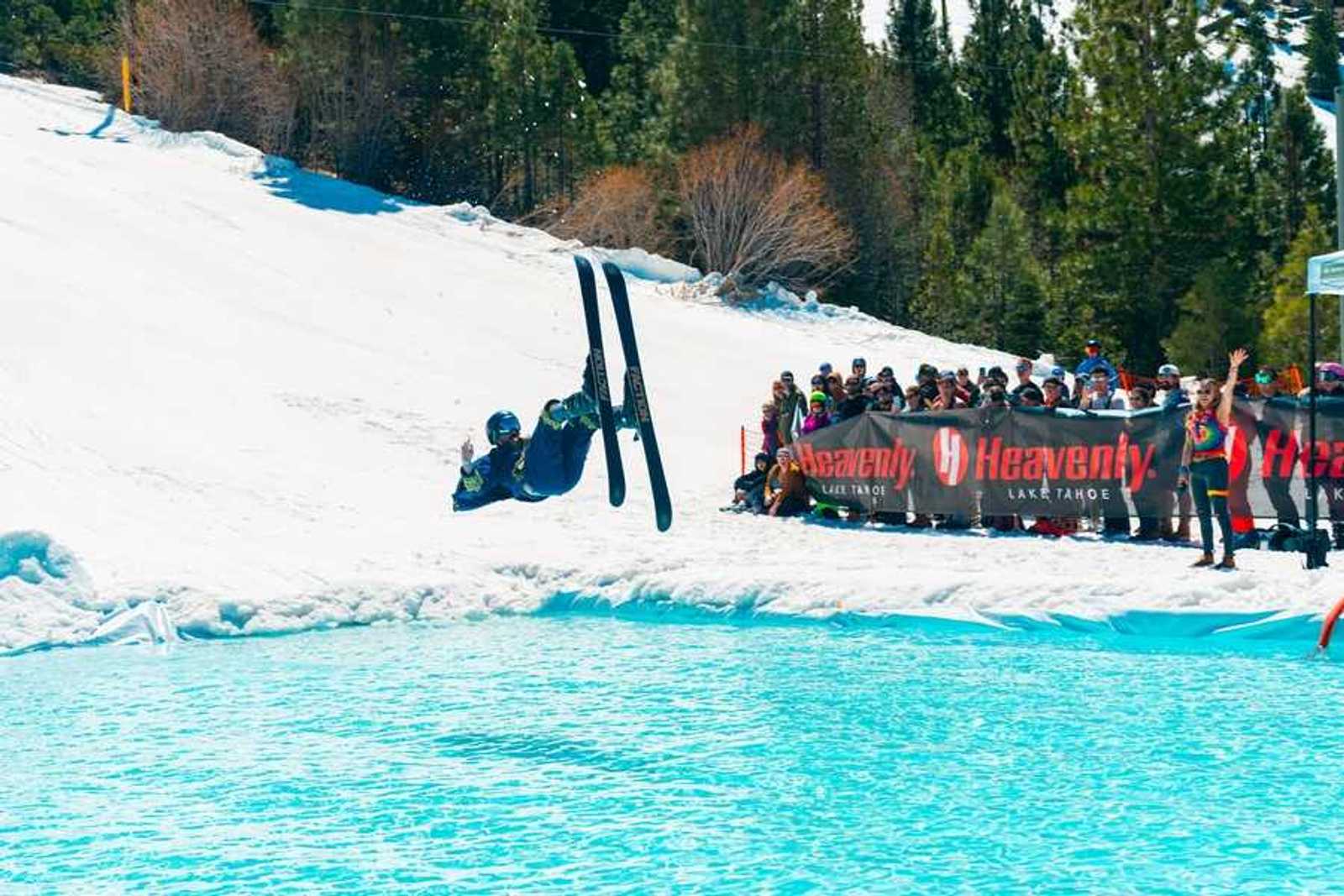 Skiers flip out at Heavenly Mountain Resort’s annual pond skim.(Courtesy of Heavenly Mountain Resort)