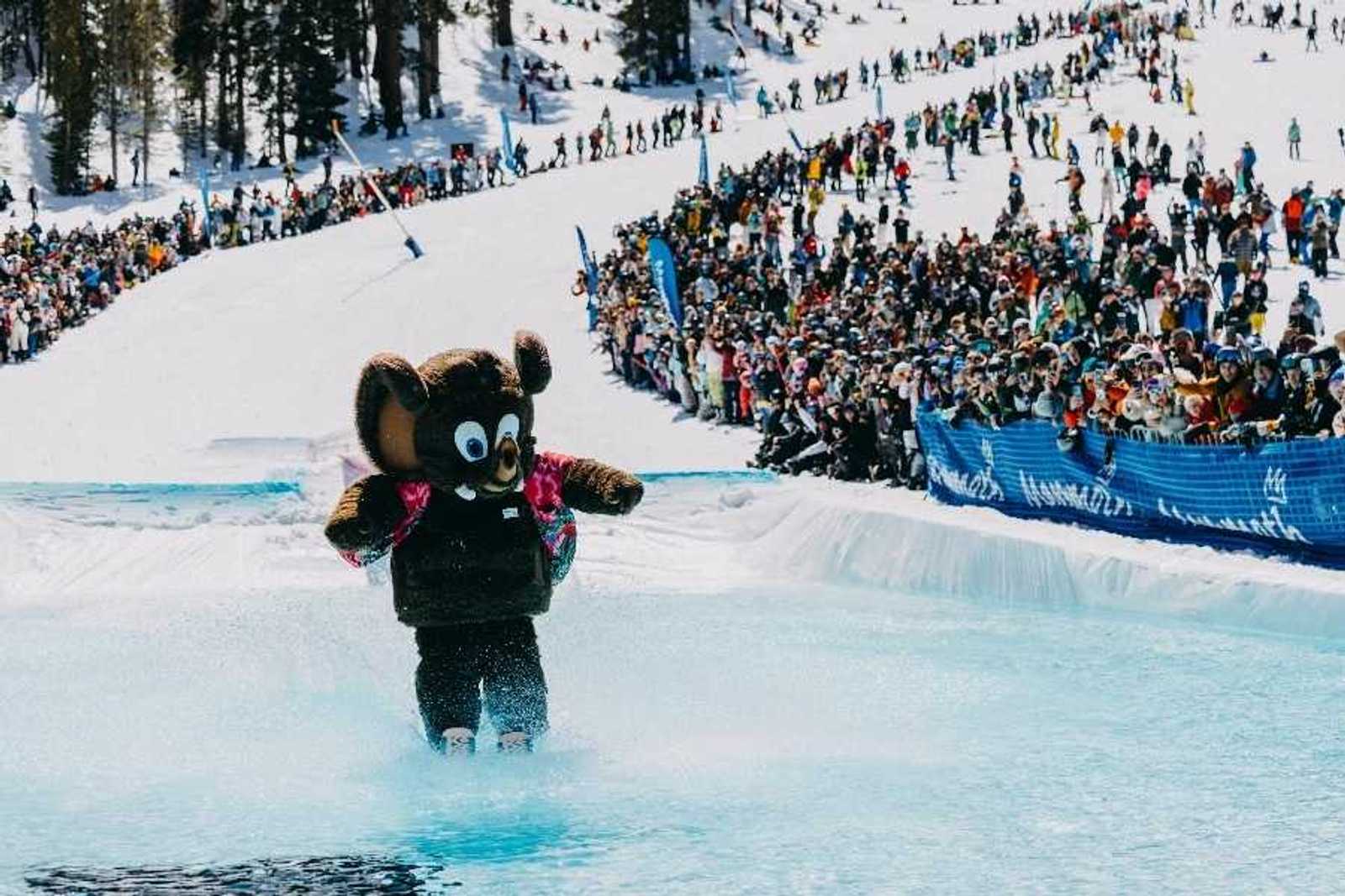 Mammoth Mountain’s official mascot Woolly letting his fur fly during the pond skim event.(Courtesy of Mammoth Mountain)